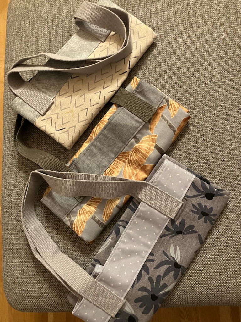 vis og fortell våren 2024 Annes matte i JellyrugAnne har sydd veske med gjenbruk og flere kuvertbrikker i JellyrugteknikkenInger Lisehar sydd mange handlenett